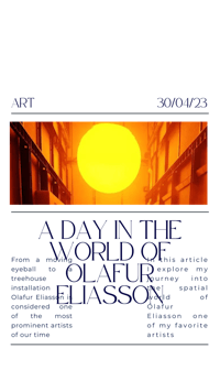 Olafur Eliasson - in my opinion, one of the most eminent artists of our time, Olafur is a Danish-Icelandic artist known for his large-scale installations that typically play with light and space to create immersive experiences.